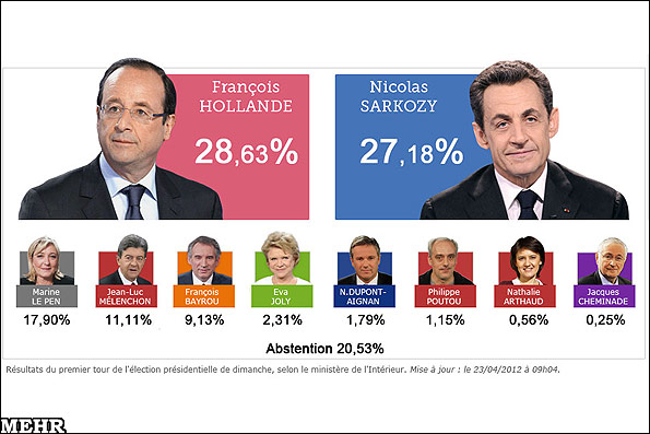 انتخابات ریاست جمهوری امروز که با حضور 80 درصدی فرانسویان برگزار شد اولاند توانست با کسب 28.63 درصد کل آرا اول شود و پس از او نیکلا سارکوزی رئیس جمهور فعلی فرانسه تنها 27.18 درصد کل آرا را به دست آورد.