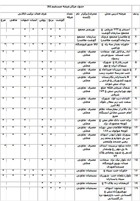 فارس: آدرس 19 مرکز عرضه 7 قلم کالای اساسی در استان تهران اعلام شد.آدرس 19 مرکز عرضه گوشت، مرغ، برنج، لبنیات، روغن، حبوبات و ماهی اعلام شد که به پیوست در جدول الصاقی به خبر قابل مشاهده است.