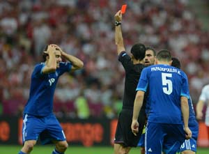 دیگر اتفاق مهم نیمه اول این بازی، ده نفره شدن تیم یونان بود. پاپاستاپولوس، مدافع یونان، در دقایق 35 و 44 اخطار گرفت و به دلیل دواخطاره شدن از زمین بازی اخراج شد.