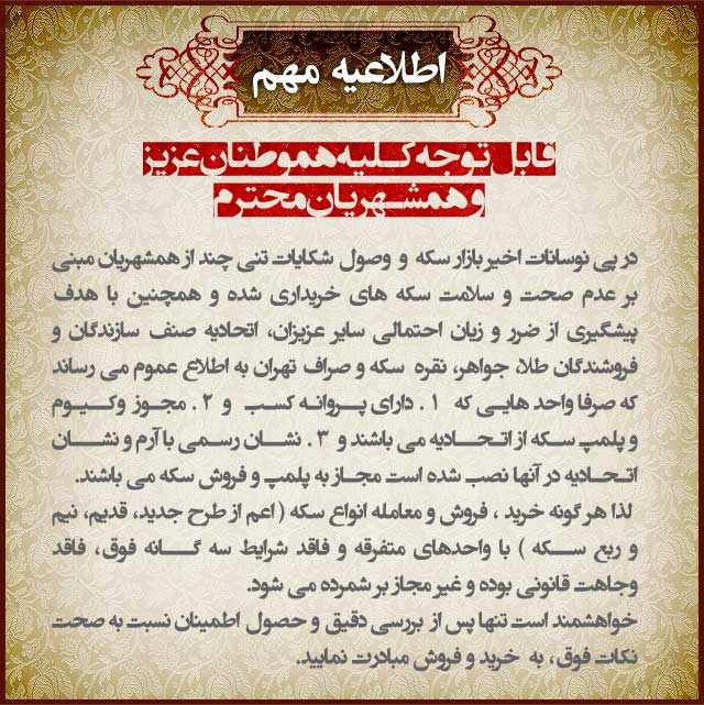 اطلاعیه اتحادیه طلا و جواهر درباره "سکه"