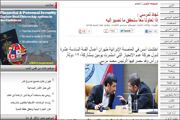 روزنامه الاهرام مصر امروز در گزارشی با چاپ تصویری از اجلاس سران جنبش عدم تعهد که در آن روسای جمهور ایران  و مصر  کنار هم نشسته اند، نوشت : احمدی نژاد به مرسی گفت که اگر دو کشور همکاری کنند، می توانند به اهداف موردنظرشان دست یابند.
