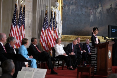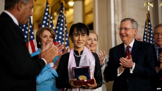 آنگ سان سوچی رهبر دموکراسی خواهان برمه روز گذشته در جریان مراسمی رسمی در کنگره آمریکا مدال طلای مجلس قانونگزاری آمریکا را که به پاس تلاش های او در راه استقرار دموکراسی در کشورش 4 سال پیش به وی اعطا شده بود ، دریافت کرد.