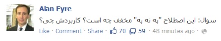 رجانیوز - آلن ایر، سخنگوی فارسی زبان وزارت خارجه آمریکا که در سالهای اخیر دامنه فعالیت خود را به شبکههای اجتماعی کشانده و تلاش میکند از این راه با کاربران ایرانی این شبکههای اجتماعی ارتباط برقرار کند، در جدیدترین مطلب خود در "فیس بوک"، معنای یک اصطلاح رایج میان جوانان را خواستار شده است.