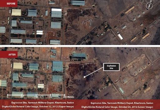 گروه "Satellite Sentinel Project" که غیر دولتی و مقر آن در آمریکاست و موسس آن جورج کلونی یک هنر پیشه آمریکایی است با صدور بیانیه ای اعلام کرد: تصاویر ماهواره ای نشان دهنده ایجاد شش حفره بزرگ با عرض هر یک از آنها 16 متر ، در محل کارخانه الیرموک در پایتخت سودان است.