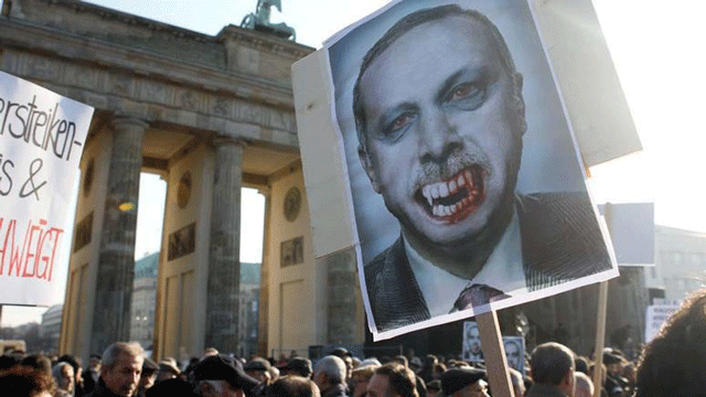جمعی از فعالان مخالف جنگ که در بین آنها از اروپایی های مخالف سیاست ترکیه تا ترک های مقیم آلمان به ویژه کردهای ساکن این کشور بودند در برلین علیه اردوغان تظاهرات کردند و سیاست های آنکارا در قبال سوریه و کردهای ترکیه را محکوم کردند. آنها شعار می دادند :"جنگ طلب گمشو!" ترکیه از مخالفان مسلح حکومت سوریه حمایت های همه جانبه مالی و تسلیحاتی می کند.دولت دمشق آنکارا را به راه انداختن جنگ داخلی در سوریه متهم می کند.
