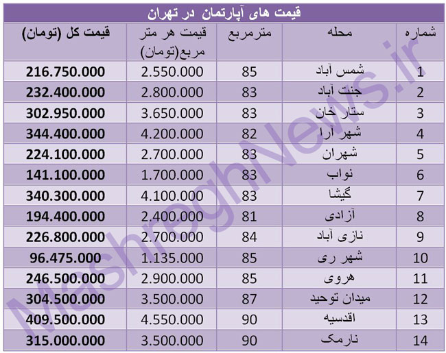 نرخ پیشنهادی آپارتمان تا 90 متر (جدول)