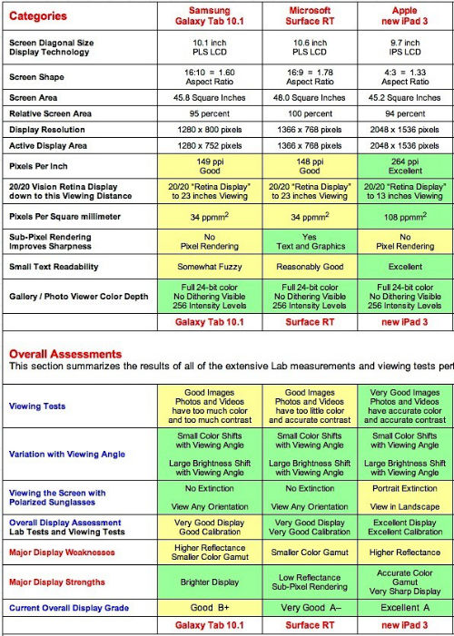 در ادامه مطلب می توانید جدول کامل تست مقایسه ای سرفیس آر تی با گلکسی تب 10.1 و نیو آیپد 3 را مشاهده کنید. همان طور که می بینید، سرفیس با اقتدار از سامسونگ رد شده و به خوبی شانه به شانه آیپد 3 مجهز به نمایشگر رتینا جلو می رود.