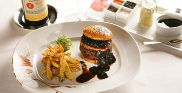 این همبرگر با گوشت کوبه ژاپنی،قارچ سیاه دنبلان،یک نان فرانسوی و سس قارچ دنبلان درست می شود.