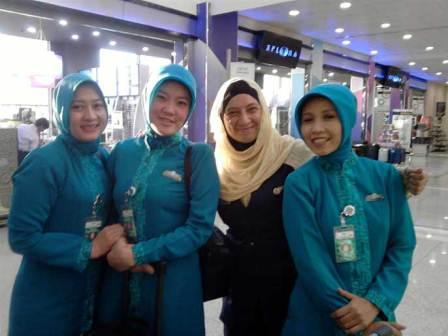 "مایسه عبدالهادی" مهماندار محجبه شرکت هواپیمایی مصر در کنار همکاران خود از شرکت هوایی اندونزی