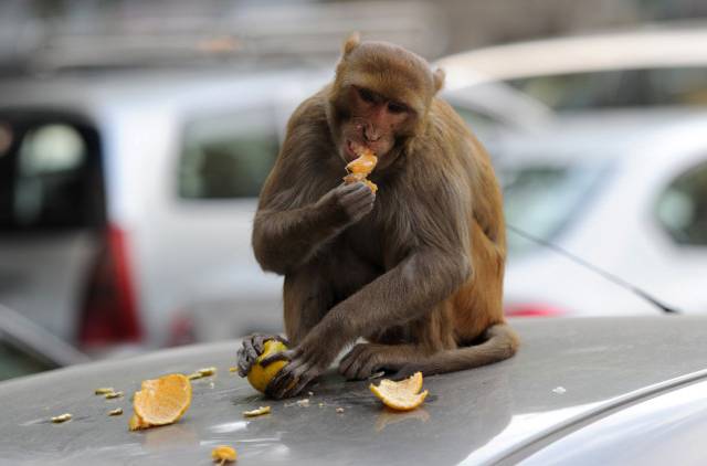 زیست نیوز: میمون یکی از مشتریان در بازار روز بمبئی(هند) ناهار میوه ای خود را بر سقف اتومبیل صاحبش میل می کند!