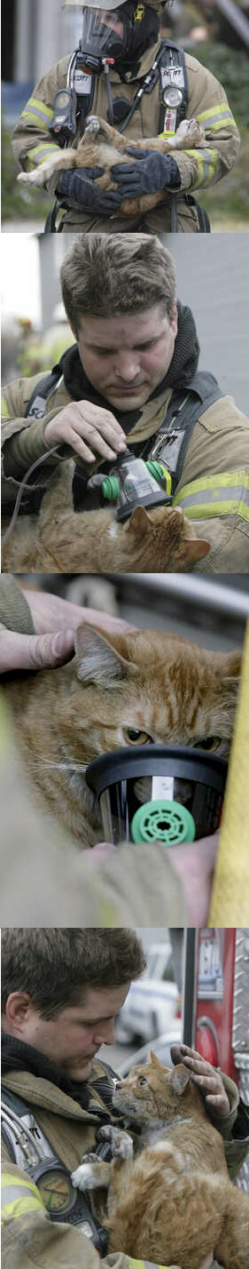 یه گربه صحیح و سالم نجات پیدا کرده، چقدر آتش نشان با محبت باهاش برخورد کرده، بهش اکسیژن هم داده
