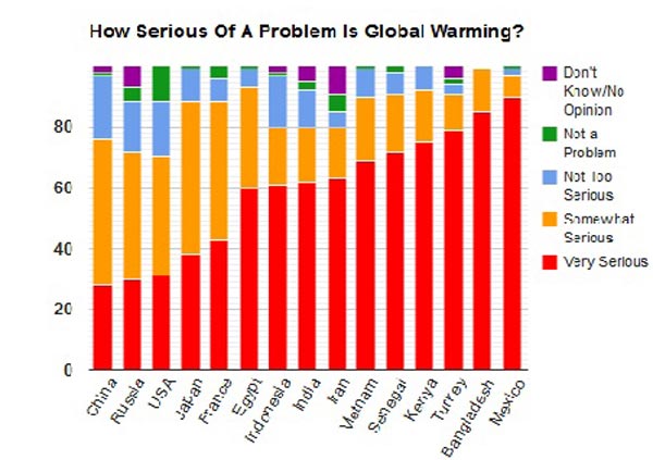 90 درصد مکزیکی ها مساله تغییرات اقلیمی را موضوعی بسیار جدی و 7 درصد نیز آن را تا حدودی جدی می دانند ، در حالی که تنها 28 درصد چینی ها این موضوع را " بسیار جدی " و 48 درصد نیز تا حدودی جدی می دانند.