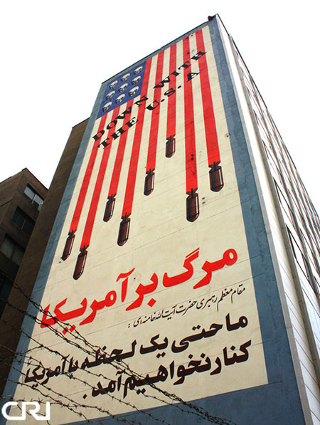 بلوار کریمخانزند تهران در حدود سه دهه گذشته همچنین میزبان نقاشی دیواری بزرگ و مشهور دیگری بوده که در سال ۸۸ بازسازی شده و از دیدگاه آیتالله خامنهای، رهبر ایران، برقراری رابطه با ایالات متحده را به کلی رد میکند. تاکنون بسیاری از مفسران سیاسی از آن به عنوان نماد تنفر ایران از آمریکا یاد کرده و گفتهاند تا زمانی که این دیوار پابرجاست، جمهوری اسلامی و ایالات متحده با یکدیگر آشتی نخواهند کرد. همچنین پیشتر آیتالله هاشمی رفسنجانی، رئیسجمهور پیشین ایران گفته بود که در دوران ریاست جمهوری خود خواستار مذاکره با آمریکا شده بود، اما هرگز موفق نشد تا آن را به سرانجام برساند.