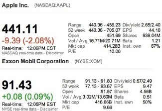سرانجام ساعتی پیش ارزش سهام اپل به ۴۴۱ دلار به ازای هر سهم رسید و حالا این شرکت نفتی اکسان موبیل است که در رتبه اول جهان قرار گرفته است و اپل به مقام دوم تنزل پیدا کرده است.