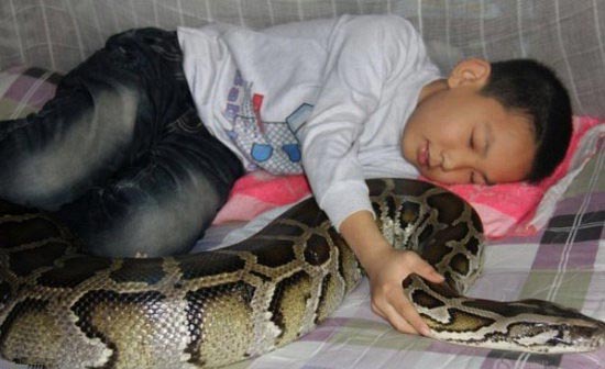 «لیئو» تمام طول روز را با این مار پیتون میگذراند و حتی موقع خوابیدن هم از او جدا نمیشود.