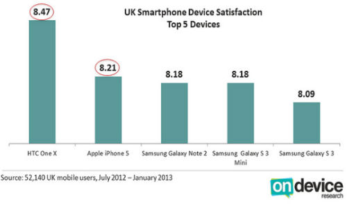 البته اپل در بریتانیای کبیر جایگاه بسیار بهتری دارد و آیفون 5 در انگلستان با امتیاز 8.21 توانسته پس از One X اچ تی سی، جایگاه دوم را از آن خود کند. البته در انگلیس سامسونگ هر سه جایگاه بعدی را با قدرت اشغال نموده و گلکسی نوت دوم، گلکسی اس ۳ مینی و گلکسی اس سوم در مکان های سوم تا پنجم قرار گرفته اند.