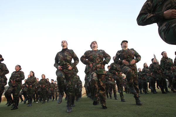 در رژهای که در پایان تمرینات در استادیوم صورت میگیرد، زنان با نهایت توان خود فریاد میزنند: "با خون و جانمان، خود را فدای تو میکنیم، ای بشار!"