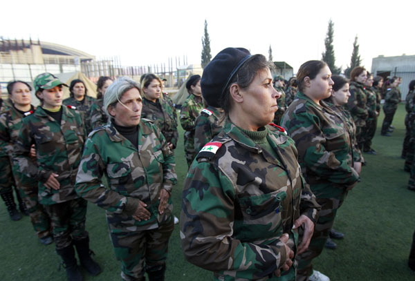 اولین واحد زنان "نیروهای دفاع ملی" در سوریه در شهر حمص تشکیل شده است و در آن زنان مبارز از سنین 18 تا 50 سال حضور دارند. نادا جعجع، یک فرمانده بازنشسته که مسئولیت آموزشها را برعهده دارد، میگوید دلیل انتخاب حمص تجربهی وضعیت اسفناکی است که این شهر از سر گذرانده است.