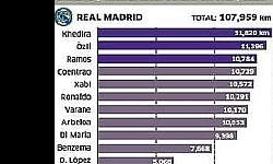 سامی خدیرا نیز همراه با آلونسو عملکرد فوقالعادهای داشت و بازیکنی بود که در این مسابقه بیشترین مسافت طی شده را با 11 کیلومتر و 820 متر به خود اختصاص داد. مسعود اوزیل دیگر بازیکن آلمانی رئال در این فهرست در مکان دوم قرار گرفت. اوزیل در مسابقاتی مثل رویارویی با صدرنشینان لیگ برتر تواناییهای بیشتری از خود به معرض نمایش میگذارد. بازیکن با استعداد رئال 11 کیلومتر و 396 متر در زمین دوید.