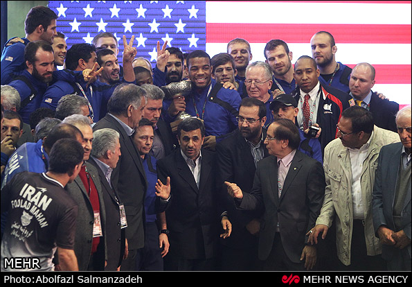 عصرایران - محمود احمدی نژاد که در مراسم اعطای مدال های تیم های برتر جام جهانی کشتی آزاد شرکت کرده بود ، به میان اعضای تیم آمریکا رفت ، با آنها دست داد و عکس یادگاری گرفت. یکی از عادت های احمدی نژاد نشان دادن علامت «V» در مقابل دوربین هاست... .