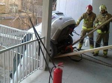 آریا: خودرو سواري پس از عدم كنترل راننده خودرو از پارکينگ به داخل حياط ساختمان مسكوني سقوط كرد.