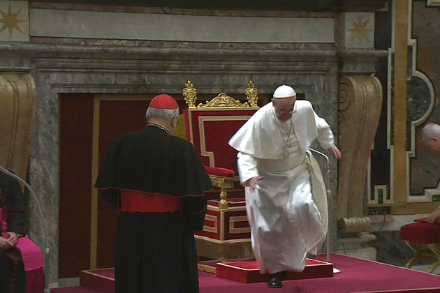 عصر ایران - پاپ فرانسیس رهبر جدید کاتولیک های جهان روز جمعه در مراسمی در کلیسای سن پترز واتیکان به هنگام بلند شدن از روی مبل مخصوص پایش لغزید اما توانست خود را جمع و جور کند.