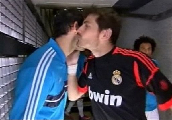 روبوسی ایکر کاسیاس با دیه گو لوپز، قبل از آغاز بازی رئال مادرید با رئال بتیس در هفته سی و دوم لالیگا