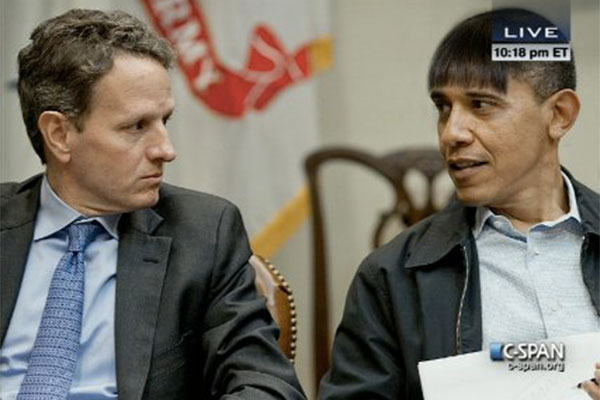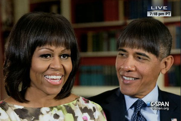 اما شاید خندهدار ترین لحظه برای خبرنگاران در این جلسه زمانی بود که اوباما عکسهایی مونتاژ شده از خودش را نمایش داد که در آنها از موهای همسرش استفاده شده بود!
