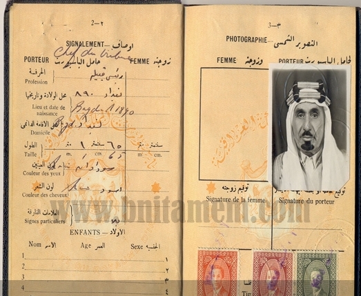 عصر ایران - گذرنامه یک رئیس قبیله در دوره حکمرانی ملک فیصل دوم پادشاه وقت عراق (1953-1958). در این گذرنامه در مقابل گزینه "شغل" عبارت "رئیس قبیله "نوشته شده است.