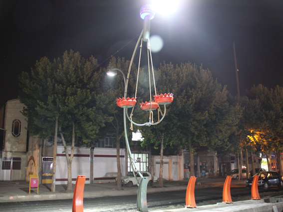 سفیدی افزود در فوق پایه چراغ ها مخزن آب طراحی شده که به صورت قطره ای ، سه گلدان لاستیکی و رزینی معلق بر روی پایه چراغ ها که گل طبیعی در آن گشت شده است را آبیاری مینماید ، گلدانها از ضایعات لاستیک های فرسوده خودرو ها که در مقابل سرما و گرما و تابش مستقیم نور آفتاب دوام بالایی دارد و با هزینه ای بسیار اندک تهیه گردیده و این پایه چراغ ها علاوه بر اینکه جهت نورپردازی و ایجاد زیبایی در شب میباشد ، بدلیل وجود سه گلدان معلق مذکور ، جلوه زیبایی در روز نیز از خود به نمایش میگذارد . مهندس سفیدی تاکید کرد که از صفر تا صد پروژه توسط دستان توانمند کارشناسان و کارگران این شرکت بومی طراحی و تولید گردیده است .