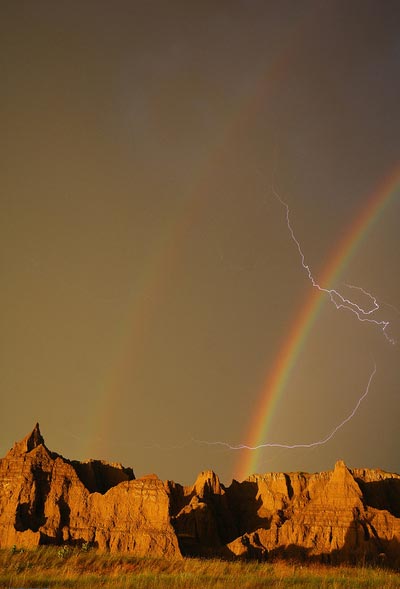 ایسنا: یک منظره نایاب از عبور برق آسمان از خلال رنگینکمان دوگانه (double rainbow) در آسمان پارک ملی بادلندز واقع در داکوتای جنوبی، شکار شد. این رنگینکمان نزدیک پایان توفان رعد و برق پدیدار شد.