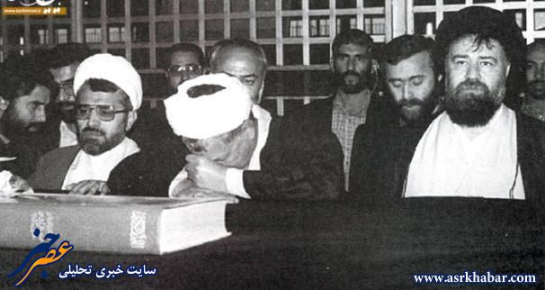 تصویر مربوط به روز ۷ تیرماه ۱۳۶۹ است. اکبر هاشمی رفسنجانی رییسجمهوری وقت به همراه حاج سیداحمد خمینی فرزند بنیانگذار جمهوری اسلامی، عبدالله نوری وزیر وقت کشور، سیدمنصور رضوی و جمعی دیگر از رجال سیاسی به مناسبت نهمین سالروز شهادت شهید بهشتی و جمعی از اعضای حزب جمهوری اسلامی به زیارت قبور شهدا و حرم امام رفتهاند.