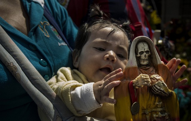بازی کودک مکزیکی با مجسمه "مرگ مقدس" در جریان یک مراسم مذهبی در مکزیکوسیتی