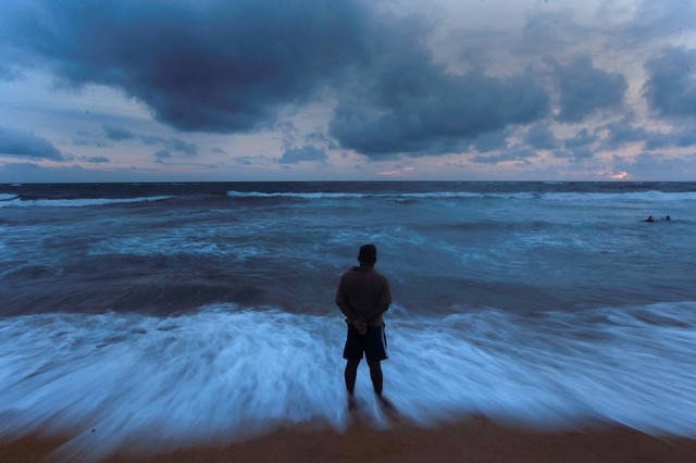 یک آرایشگر خیابانی در کلکته هند در حال کار در شرایط سیلاب