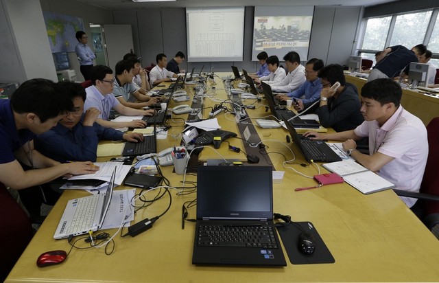 کارکنان ایرلاین کره جنوبی در دفتر کارشان در سئول مشغول چک لحظه به لحظه خبر سقوط بویینگ 777 شرکت شان در فرودگاه سان فرانسیسکو آمریکا. در این سانحه تنها دو تن از صدها مسافر هواپیما کشته شدند