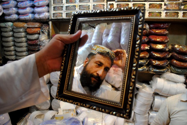 مرد پاکستانی در حال خرید کلاه در مغازه ای در پیشاور