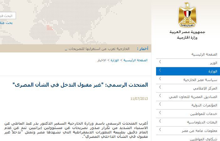 سخنگوی وزارت خارجه مصر برای دومین مرتبه در دو هفته بعد از سقوط مرسی به اظهارات مقامات ایرانی درباره کشورش اعتراض کرد.