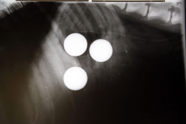 نتایج آزمایش ها و سونوگرافی نشان می دهد او سه توپ گلف را بلعیده است . پس از خارج کردن سه توپ از بدن این سگ حال او بهبود می یابد.