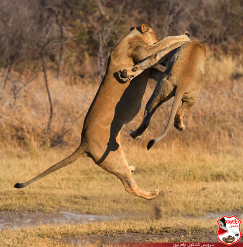 گیوین تانکینسون عکاس این تصاویر می گوید: من تابحال ندیده بودم یک شیر اینقدر به هوا بپرد. به نظر من دعوای این دو ماده شیر بیشتر شبیه به کونگ فو بود.