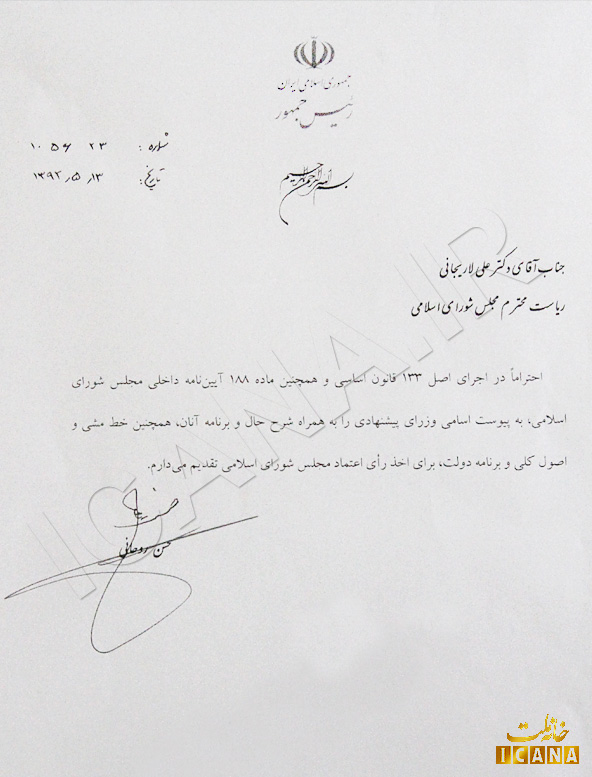 نامه دکتر روحانی به رئیس مجلس برای معرفی کابینه پیشنهادی به شرح ذیل است:
