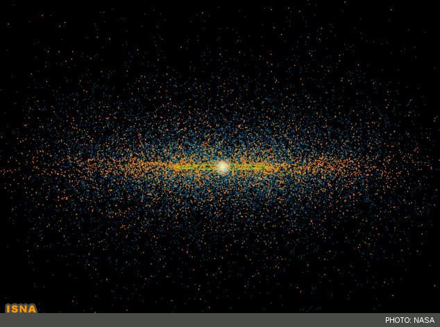 تصویر تجمع سیارکهای اجسام نزدیک به زمین به رنگ آبی و سیارکهای احتمالا خطرناک به رنگ نارنجی