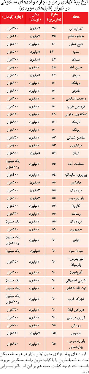 اما ارزان ترین واحد مسکونی روز گذشته متعلق به سوئیتی 25 متری در خیابان تهرانپارس بود که با 2 میلیون تومان ودیعه و 300 هزار تومان اجاره ماهانه به بازار اجاره پیشنهاد شده بود.