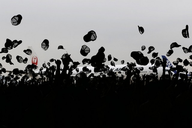 1200 ژاپنی به مناسبت حمایت از انتخاب شهر توکیو برای برگزاری المپیک تابستانی 2020 کلاه هایشان را در فرودگاه "هاندا" توکیو بالا می اندازند