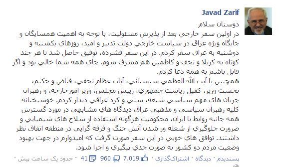 عصر ایران - محمدجواد ظریف وزیر خارجه ایران با انتشار متن جدیدی در فیس بوک، گزارشی از نخستین سفر خارجی خود (سفر به عراق) ارائه کرد.