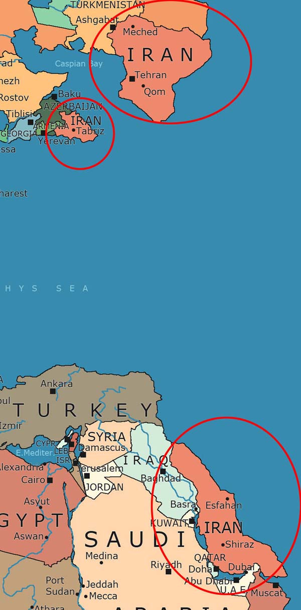 در این میان اما وضع کشور ایران از همه عجیبتر و جالبتر بود. بر اساس این نقشه در آن سالها چیزی به اسم فلات ایران شامل سرزمینی واحد و یکپارچه وجود نداشت. سرزمین هایی که حالا ایران را تشکیل داده اند سه قسمت مجزا در گوشه و کنار دنیا بودند. یک تکه بزرگ شبه جزیره مانند که شامل شهرهایی مثل تهران و قم و مشهد می شد از سمت شمال با کشورهای افغانستان و ترکمنستان هم مرز بود و از بقیه جهات به دریای خزر و اقیانوس ختم می شد.