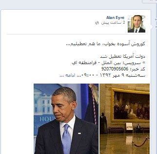 عصر ایران -  "آلن ایر" سخنگوی فارسی زبان وزارت خارجه آمریکا در واکنش به تعطیلی بخشی از دستگاه های اداری این کشور به دلیل اختلافات بر سر بودجه  در صفحه فیس بوک خود نوشت: کوروش آسوده بخواب ما هم تعطیلیم ... .