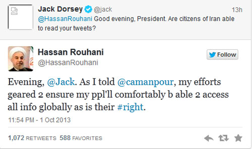 به گزارش عصر ایران جک دورسی 37 ساله  بنیانگذار و مدیر توییتر در صفحه توییتر روحانی نوشت: " عصر بخیر آقای رییس جمهور.  آیا مردم ایران قادر به خواندن توییت های شما هستند؟"