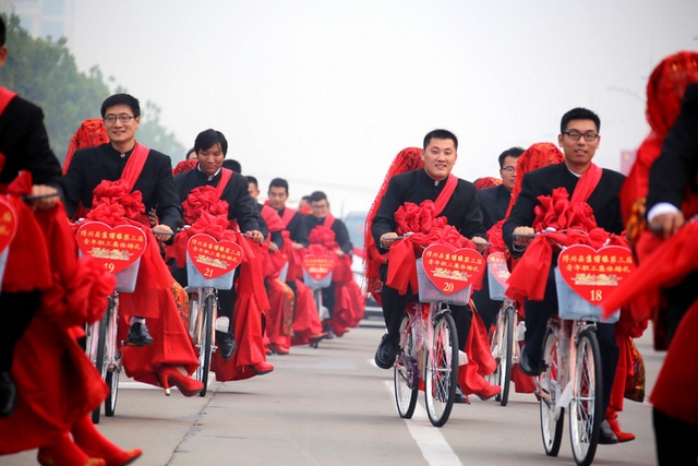 در یک جشن عروسی گروهی در شاندونگ چین عروس و دامادها دوچرخه را به جای ماشین عروس برگزیدند