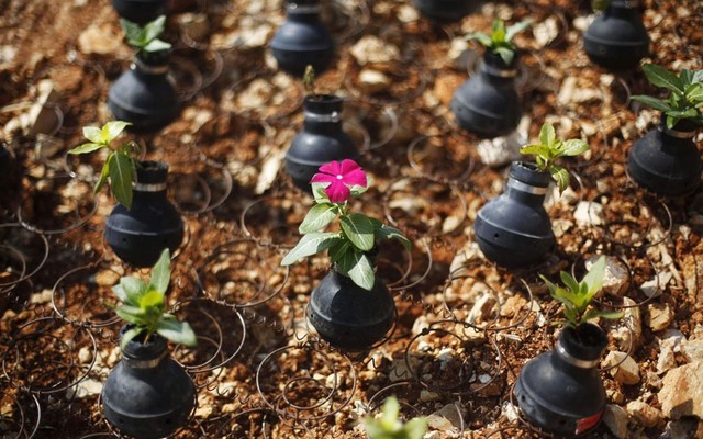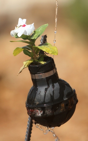 استفاده بهینه از گلوله گاز اشک آور از سوی یک خانواده فلسطینی به عنوان گلدان