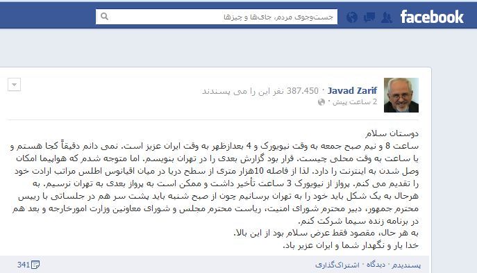 متن نوشته ظریف به هنگام حضور در پرواز بازگشت به ایران به این شرح است: